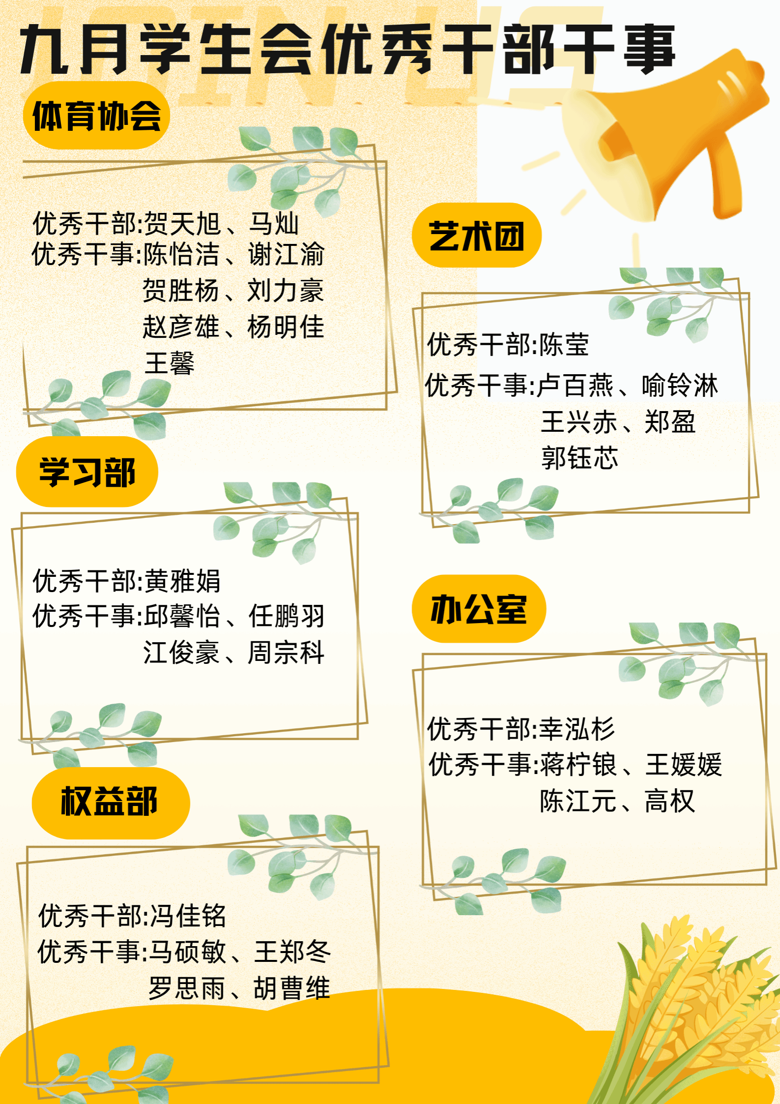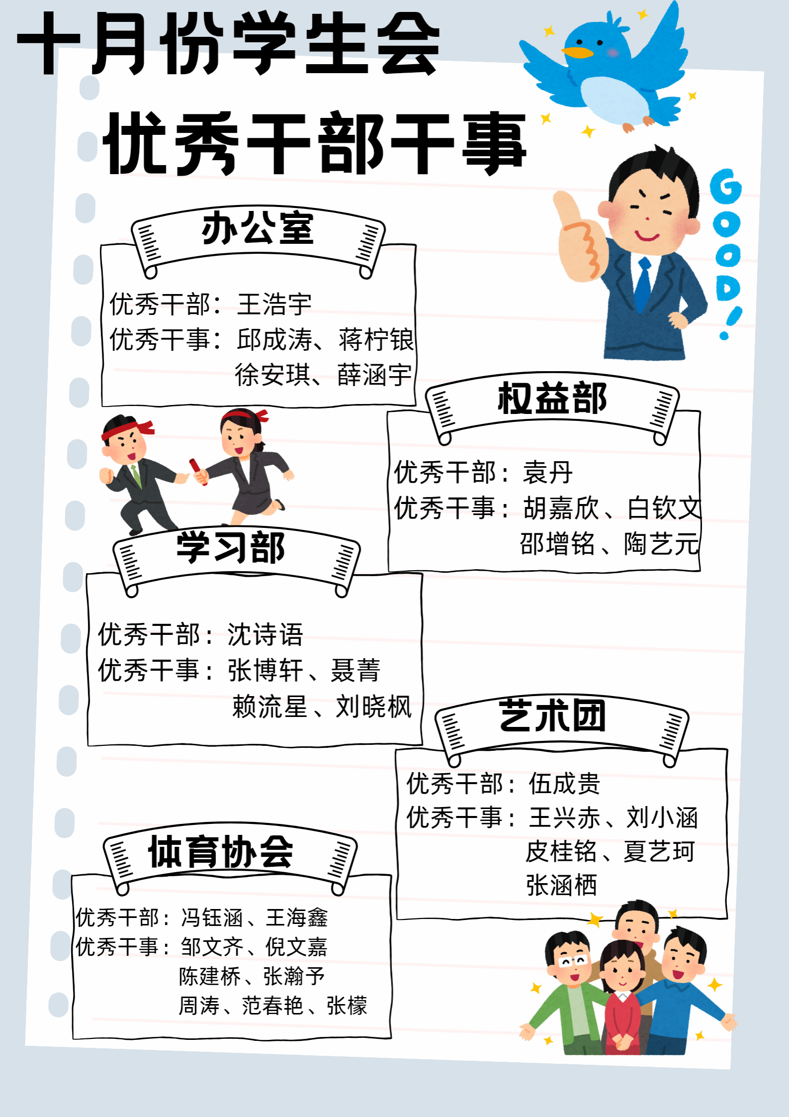 这两个月里,这些优秀的小伙伴们凭着高度的责任感和敬业精神,在学生组织的各项事务中“冲锋陷阵”。他们不光把自己的本职工作完成得漂漂亮亮,更在团队协作中将大家紧紧凝聚在一起,以积极的行动推进了整体工作。希望受到表彰的同学能持续发挥模范引领作用,也激励全体学生组织成员以他们为榜样,携手提升学生组织的服务水准,共同打造更温馨、更优质的校园环境。