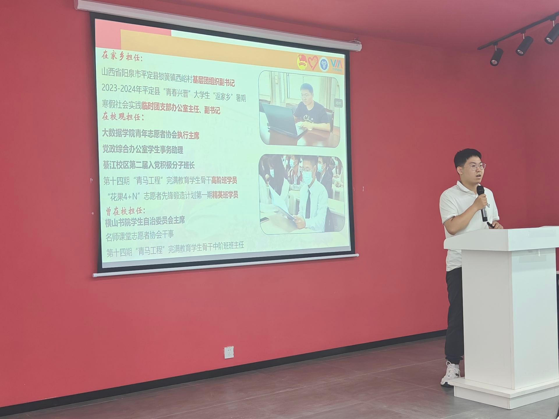 活动特别邀请了贾轩学长,他在家乡担任山西省阳泉市平定县锁簧镇西峪村基层团组织副书记,并荣任2023年平定县“青春兴晋”大学生“返家乡”暑期社会实践临时团支部办公室主任。在校期间,他担任大数据学院青年志愿者协会执行会长等职务,并多次荣获国家级、省市级和校院两级的奖项,他有一颗赤诚,奋进的心,为青马学子树立了一个优秀的学习榜样!
