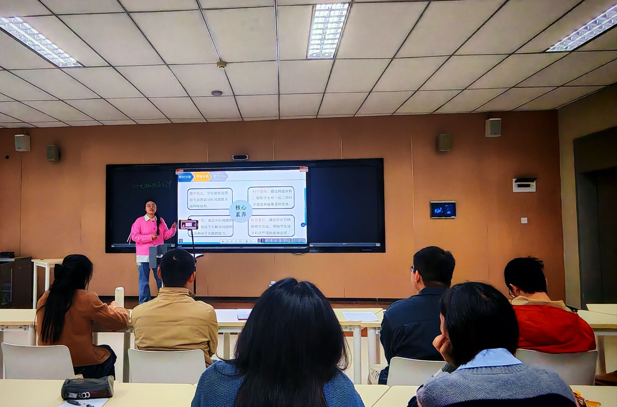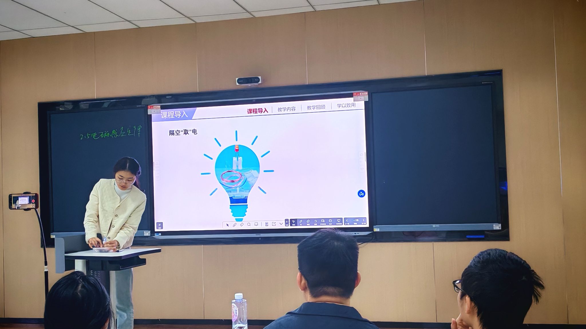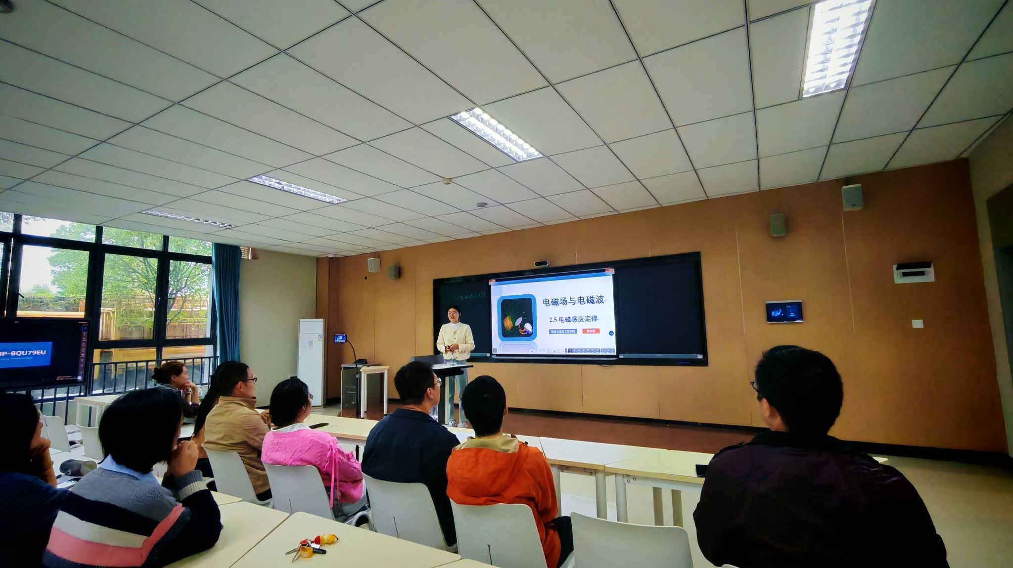 活动伊始,滕宇萍老师以“电磁场与电磁波的电磁感应定律”为主题,通过“隔空取电”实验案例导入和清晰的逻辑,生动诠释了电磁感应的基本原理及其在实际应用中的广泛影响。滕老师的讲解不仅条理清晰,而且逻辑严密,赢得了在场教师的阵阵掌声。