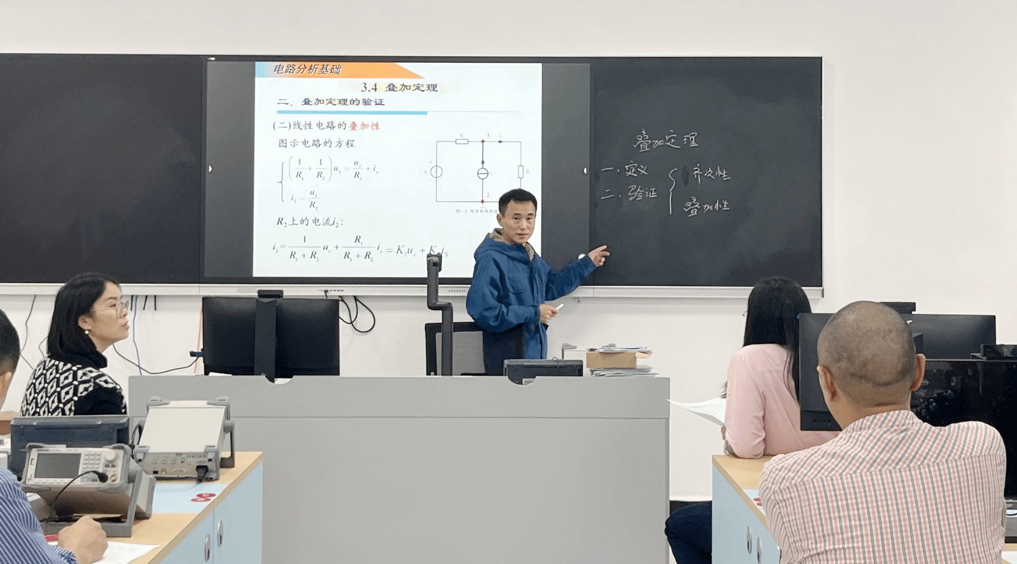 10月30日,第二期主讲人为冯杰老师。冯老师讲授内容——叠加定理,通过提出问题“电路中出现多个电源应如何分析”,引出本次课程内容的重难点叠加定理。教学过程中目标明确、思维清晰,利用multisim仿真软件虚实结合、相互印证,将抽象的理论内容直观地展示出来。