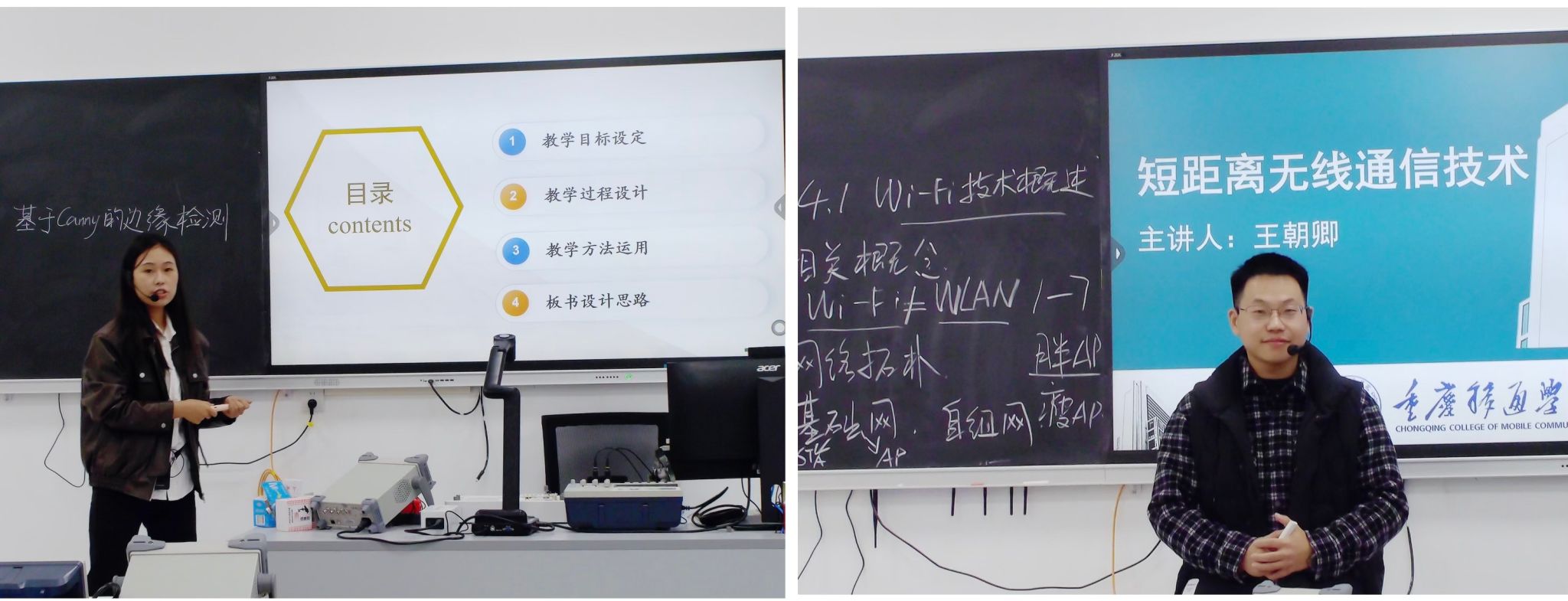 11月13日,第三期主讲人为熊莉娅老师和王朝卿老师。熊老师讲授内容——数字图像处理中的数字边缘检测,结合自动驾驶中的图像边缘检测引入课程教学内容,能有效激发学生学习积极性。王老师的讲授内容——短距离无线通信技术,利用学习通发布调查问卷,导入无线通信技术相关概念,结合现实生活展开Wi-Fi技术的讲解。授课过程中,两位老师引入课程思政自然顺畅,具有高度的启迪性和激励性,采用混合式的教学形式能提高学生的兴趣和参与性。
