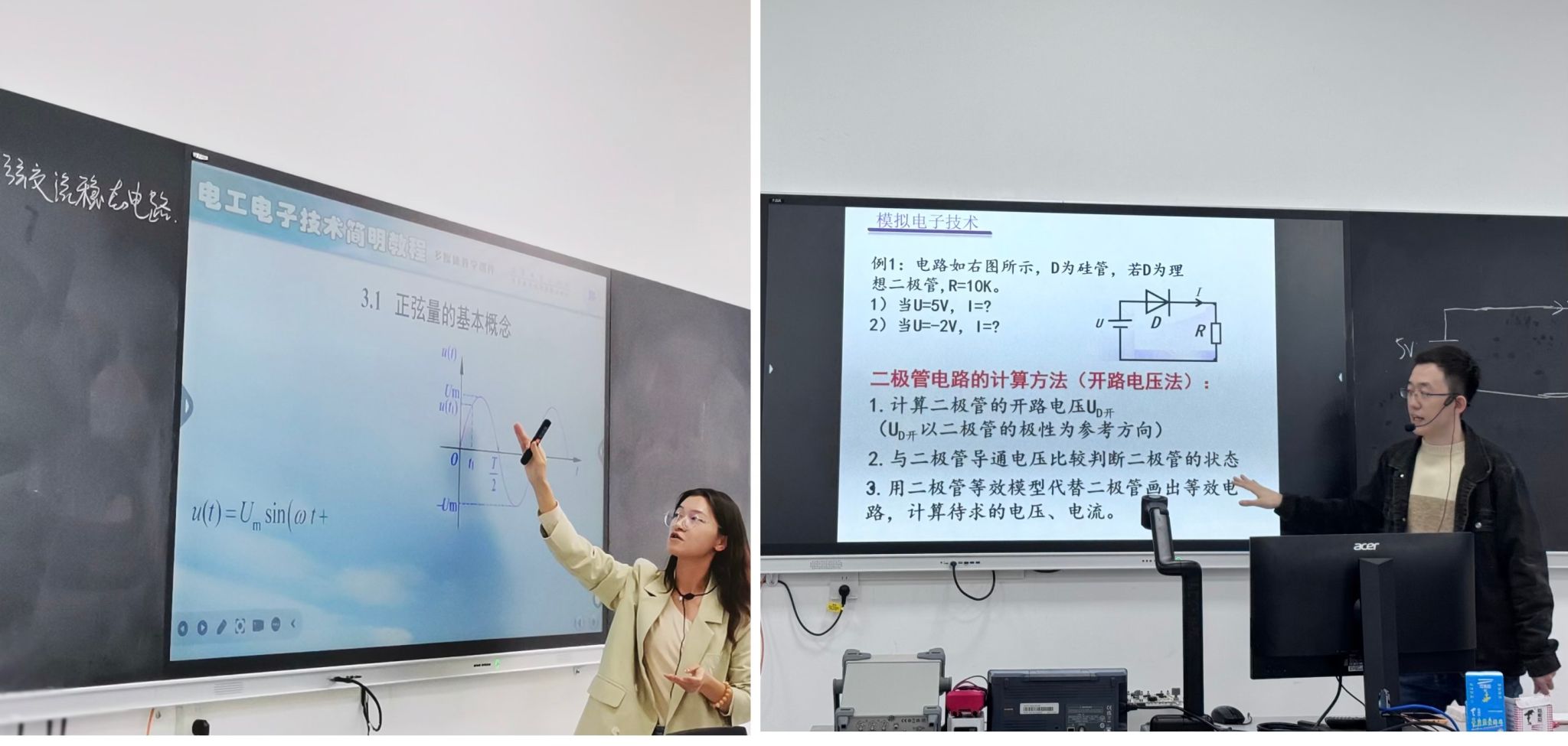 9月25日,第一期主讲人为李丹老师和王森老师。李老师讲授内容——正弦交流稳态电路,她通过日常生活中家用电引出交流电的相关概念,分析了正弦量的三要素。王老师讲授内容——二极管的等效模型,结合二极管的不同应用场景讲解了三种不同等效模型的工作状态和模型符号,通过结合动画的形式,将复杂电路分析直观化、简单化。授课过程中,两位老师精神饱满、语言清晰,各个教学环节节奏把握恰到好处,同时将晦涩的理论概念借助动画的形式生动地展示出来,加深听者的理解和掌握。