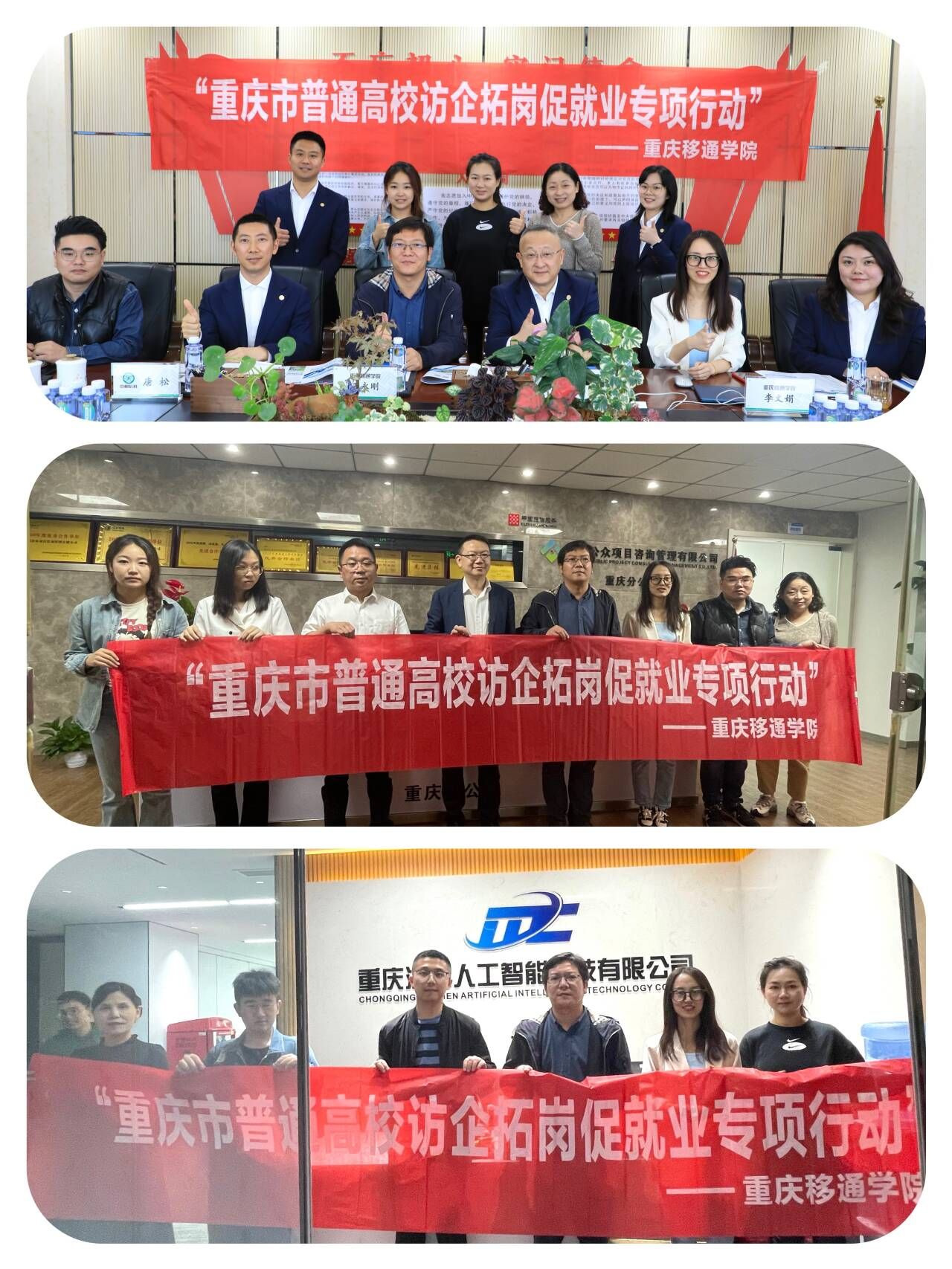 为了有效应对当前复杂多变的就业环境,解决毕业生面临的诸多就业挑战和困境,根据《重庆移通学院关于开展书记校长访企拓岗促就业专项行动方案的通知》(移通〔2024〕98号)精神,深入实施“企业走访、岗位开拓、促进就业”专项计划。4月30日,重庆移通学院副校长王永刚、通信与信息工程学院院长李文娟、通信技术教研室主任邓华阳、就业创业工作办公室主任李林燕、专任教师赵瑞玉、专任教师蒙嘉文、专任教师石钏以及实验员李晓颖一行走访了校友所在的四川公众项目投资管理有限公司、重庆信科通信建设监理咨询有限公司、重庆沐晨人工智能科技有限公司,旨在充分关心校友工作情况,深入了解行业需求,为学生开辟新的就业领域。