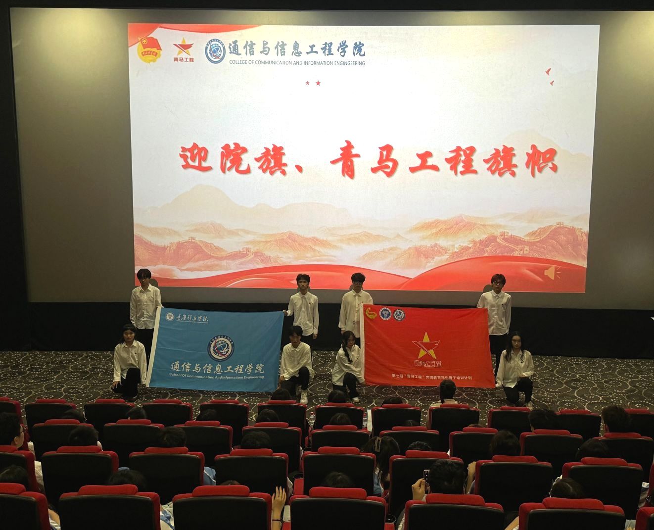 仪式伊始, 全体参会人员肃立,迎通信与信息工程学院旗帜与“青马工程”旗帜。随后,全体起立奏唱《光荣啊,中国共青团》。