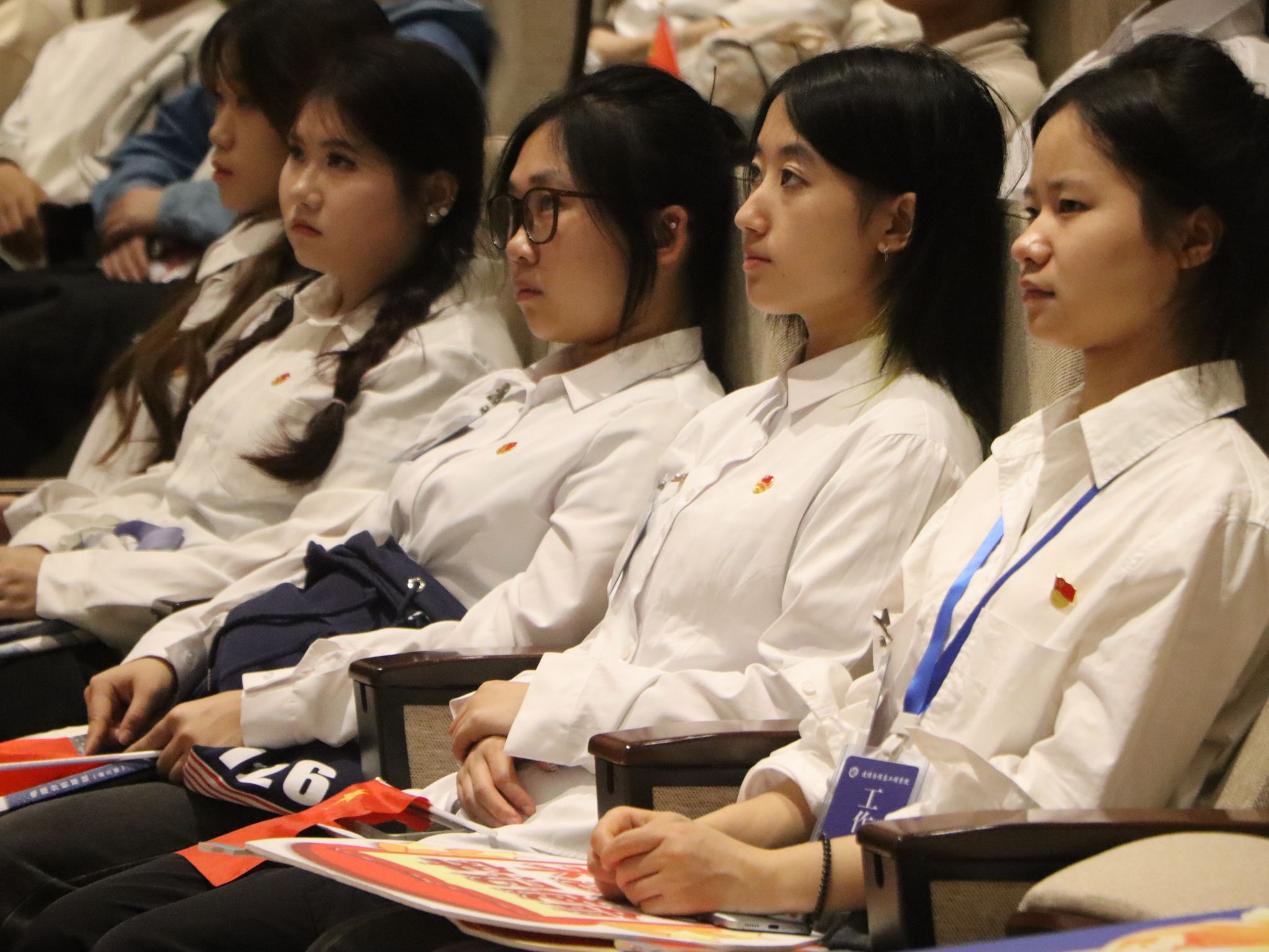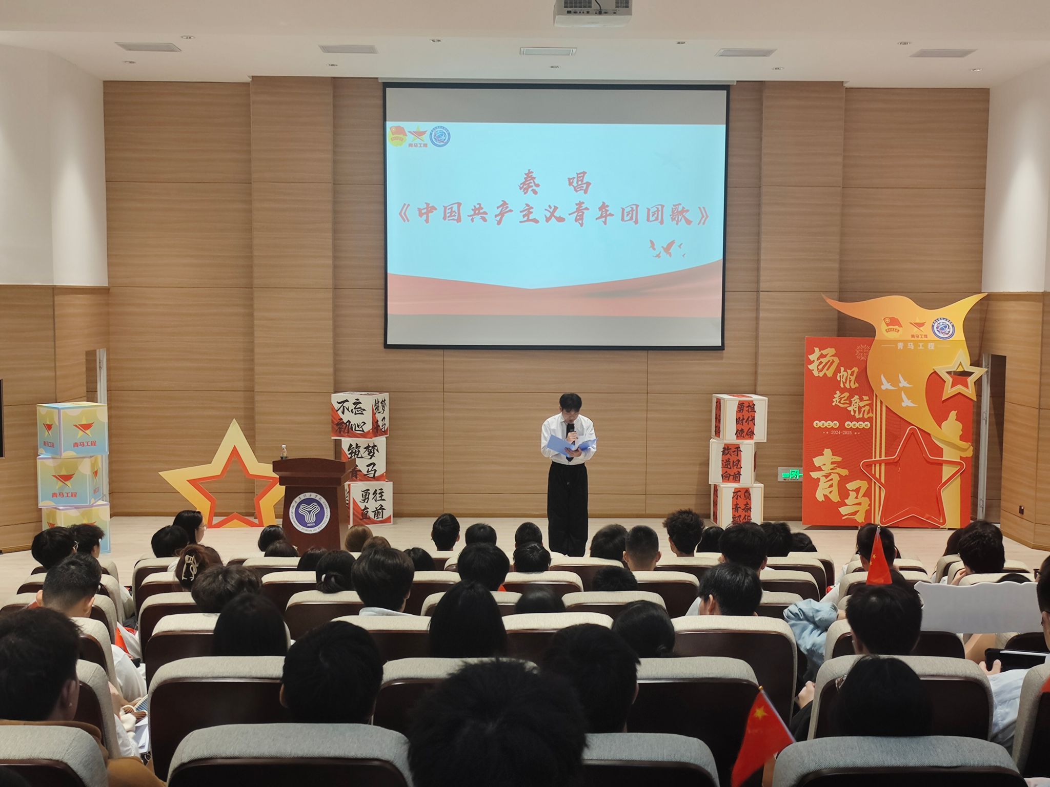 “光荣啊!中国共青团!”庄严的团歌响起,师生全体肃立,共同奏唱《中国共产主义青年团团歌》。