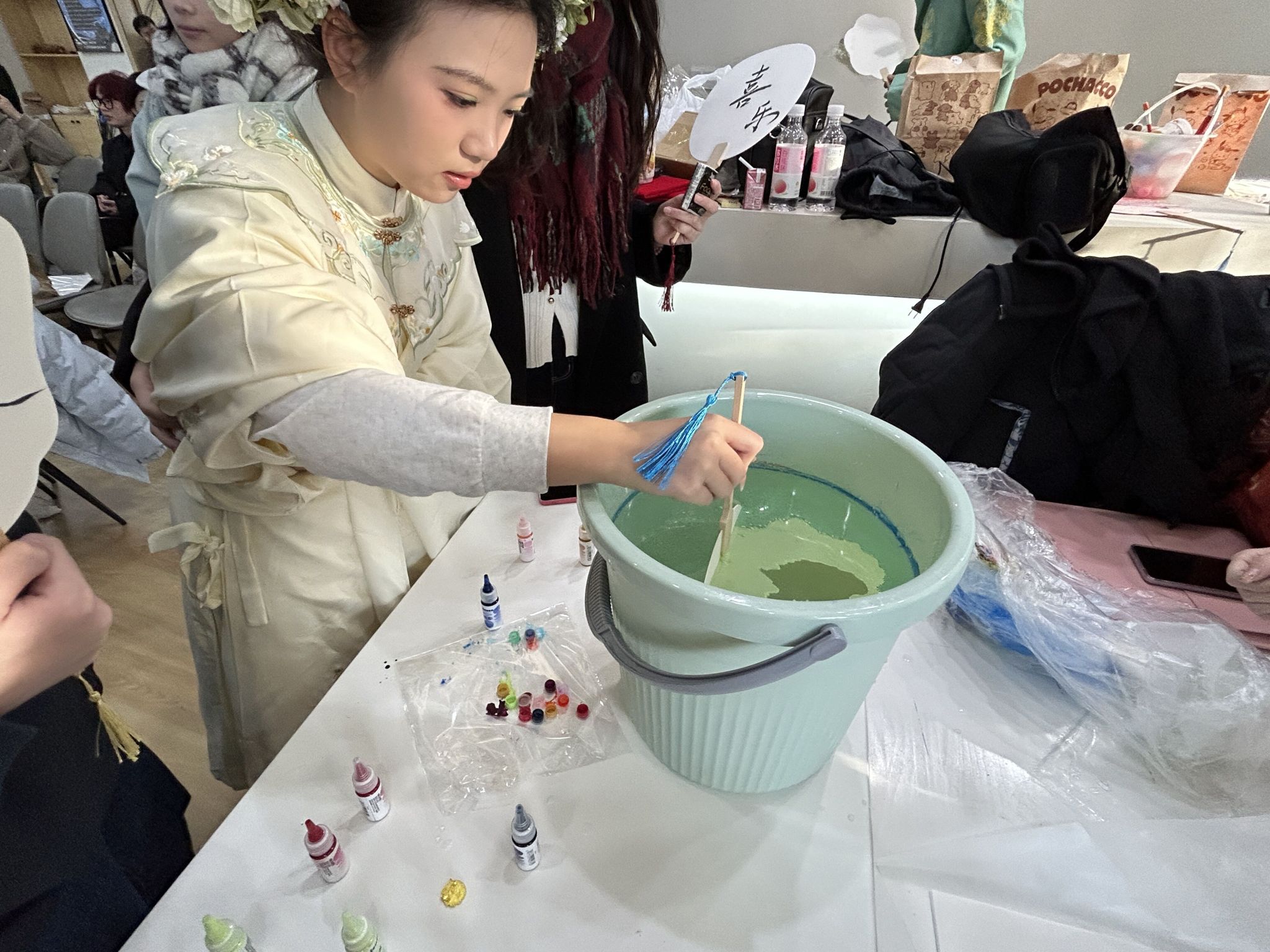 漆扇制作环节,同学们分组协作,在汉服社成员指导下精心涂抹大漆、构思扇面,发挥想象与创造,一把把精美漆扇诞生,“最美漆扇”凝聚团队心血,得奖同学成就感满满。