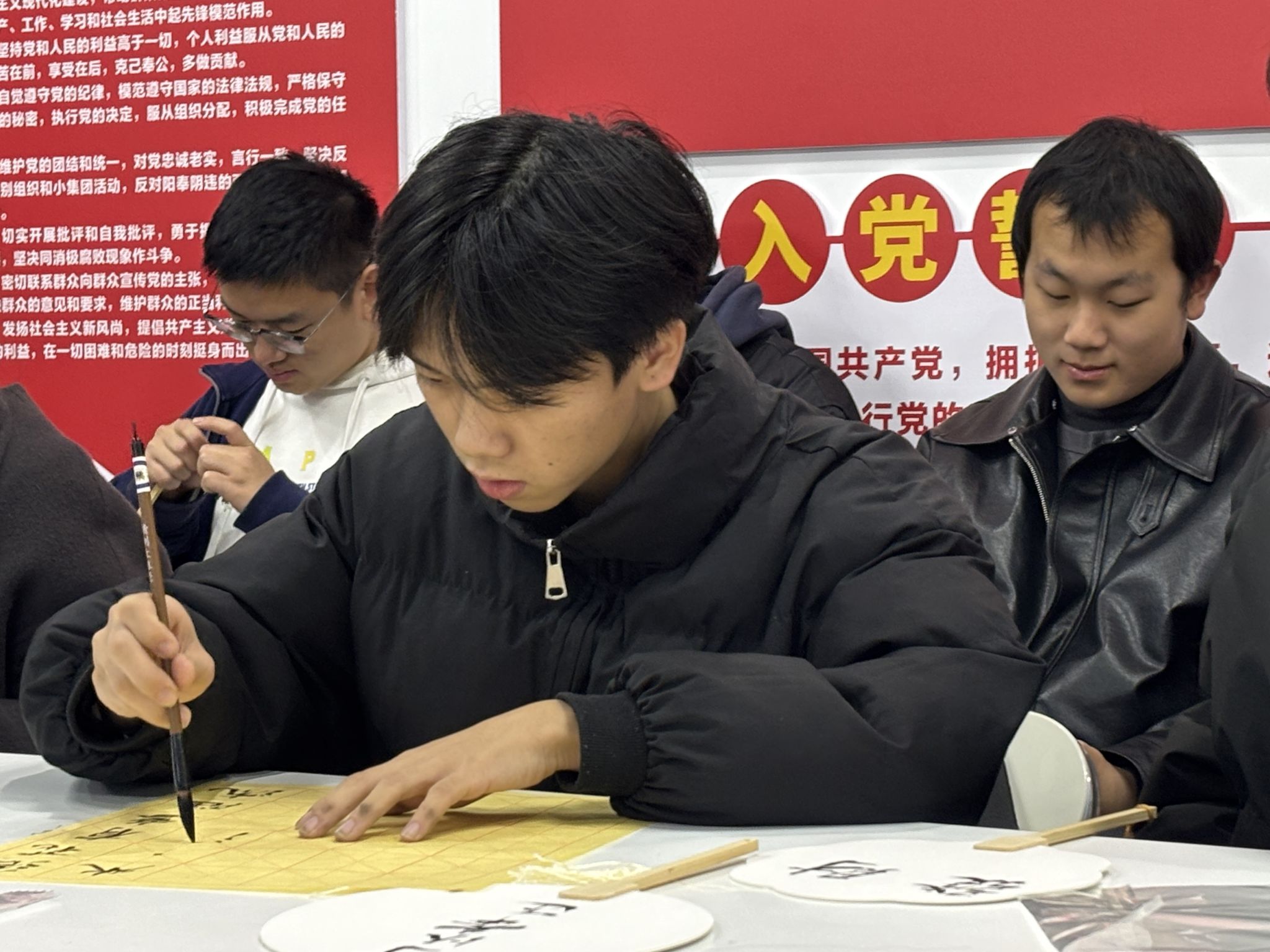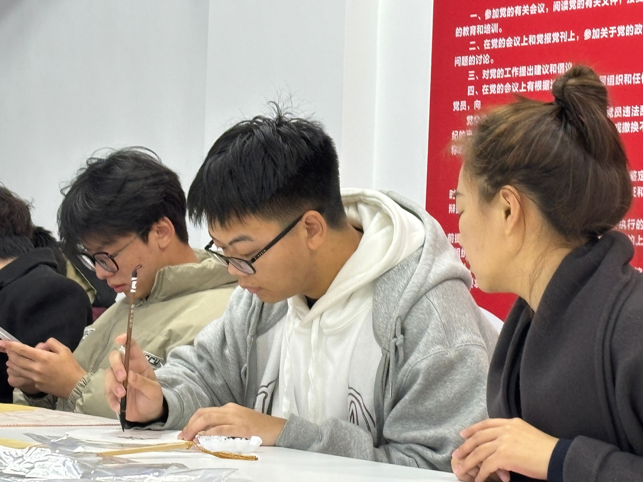 在主持人简短的活动介绍后,活动也正式拉开帷幕,支部成员们认真听完老师讲解的技巧,纷纷上手进行书写。从急于求成到放下急躁从零做起,从笨拙的执笔到慢慢上手,从歪歪扭扭的笔画到铿锵有力的落笔。这不单单是书写上的进步,更是在快节奏的生活中磨练了心性,也为心灵带来了一份平静。