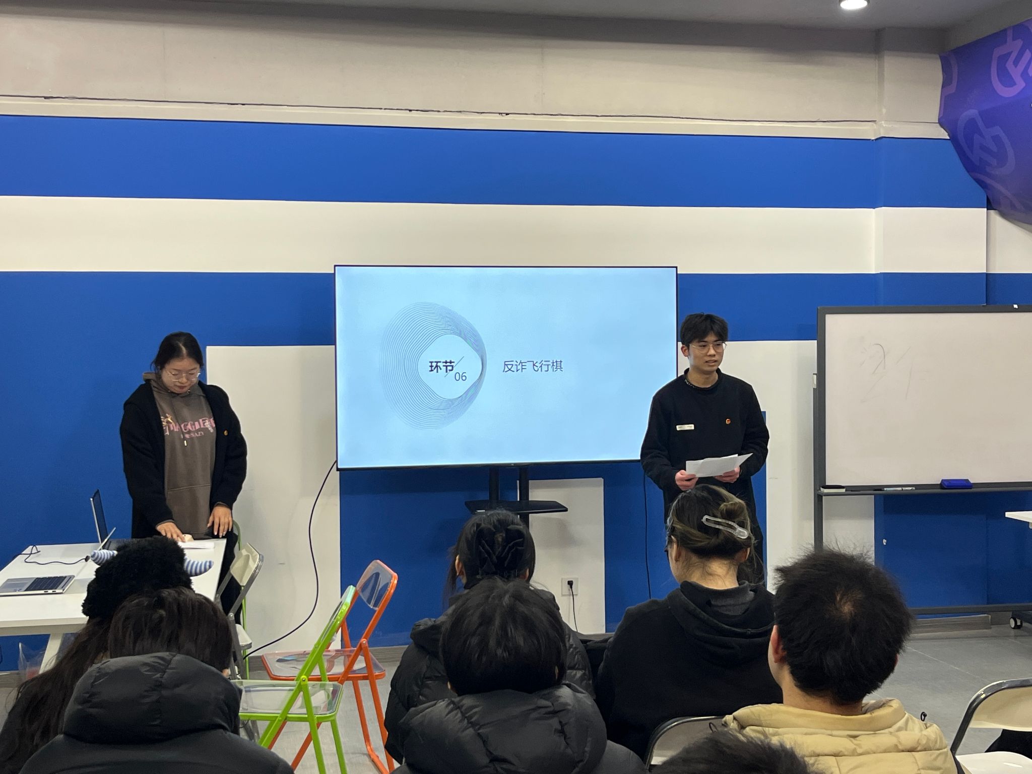 2024年12月13日 14时,2024级人工智能专升本06支部于青空朋辈畅谈室开展以“反诈护航,青春无诈”的完超活动。本次“反诈护航,青春无诈”完超活动,旨在提升同学们的反诈骗意识,构建安全和谐的校园环境。活动有反诈猜猜看、案例分、知识答题、反诈飞行棋等,这些活动让同学们在游戏中切身体体验到被骗的场景,同时也从中学到了反诈知识,提高反诈意识。
