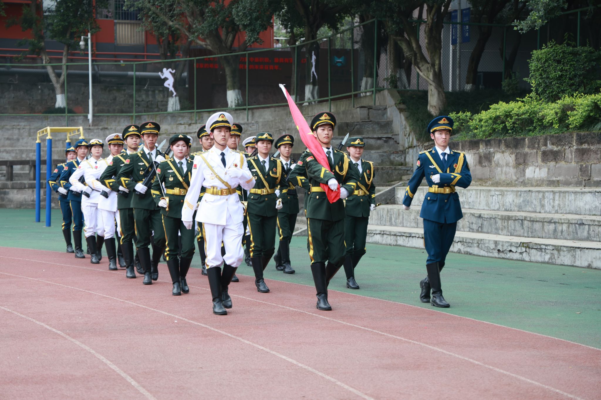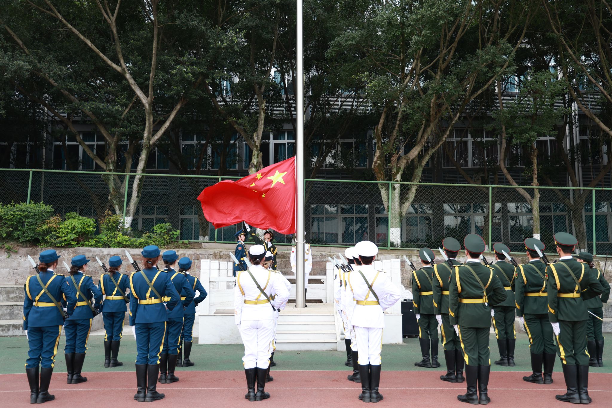 随着一声嘹亮的"立正"口令,全场肃立。7时10分,校国旗护卫队迈着整齐划一而铿锵有力的步伐,护送着国旗向升旗台前进。全体学生目光紧随国旗,场面庄严肃穆。伴随着雄壮激昂的《义勇军进行曲》的奏响,鲜艳的五星红旗迎着朝阳冉冉升起,在场师生齐声高唱,用嘹亮的国歌声抒发着自己的爱党、爱国之情。