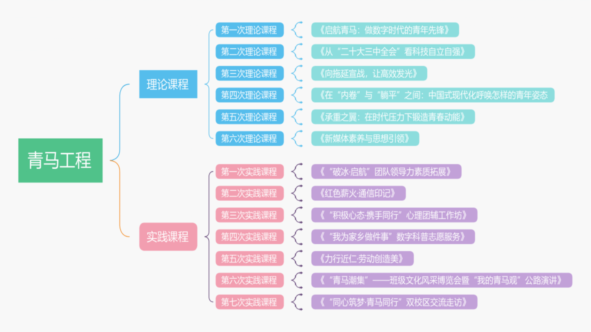 本次选拔自启动以来,学院将为新一批青马学员量身打造涵盖理论学习、红色实践、技能培训、志愿服务、课题研究等模块的培养体系,通过专题讲座、研讨交流、实践调研等多种形式,帮助学员在理论与实践的结合中坚定理想信念、提升综合能力,努力成长为能够担当民族复兴大任的时代新人。(培养体系图如下)