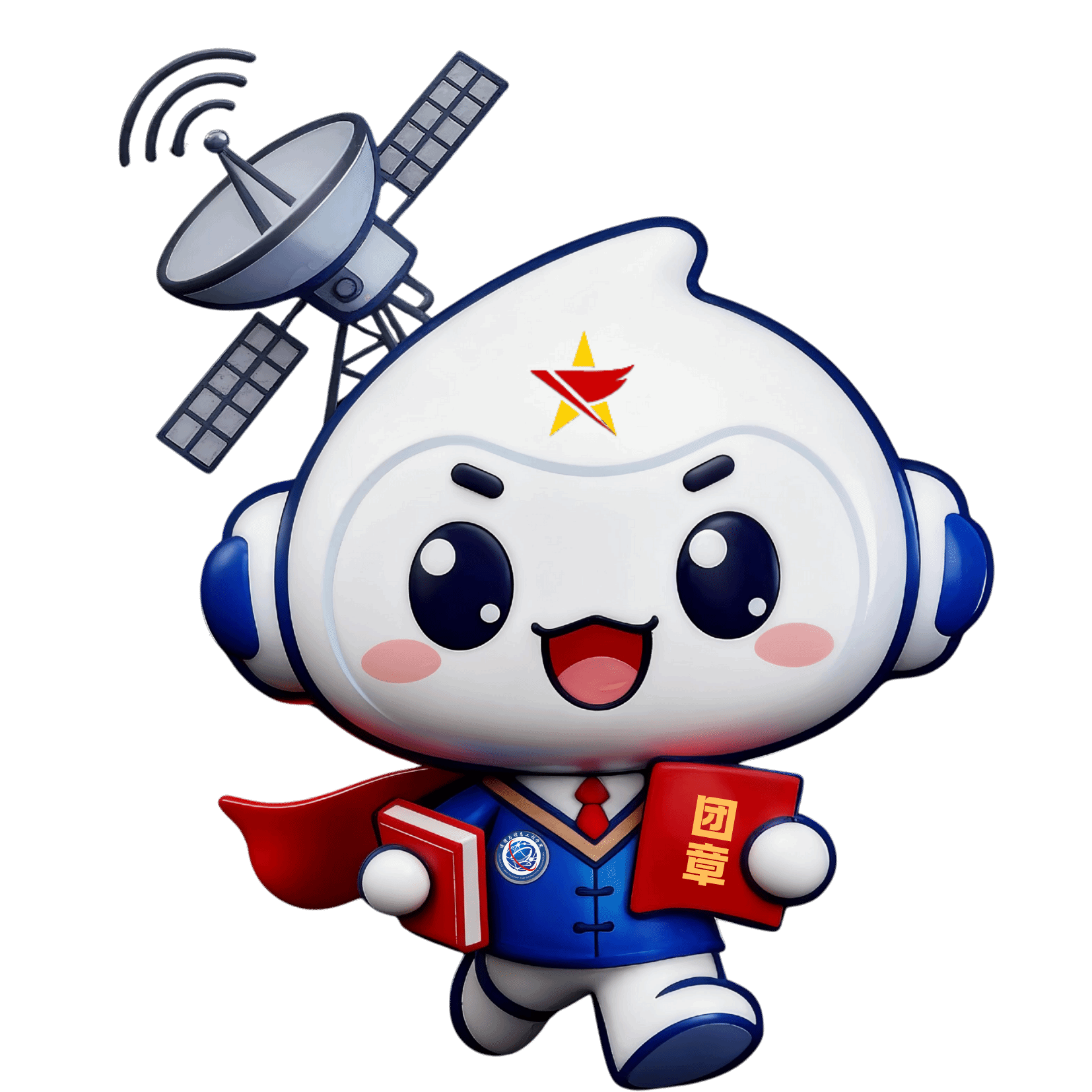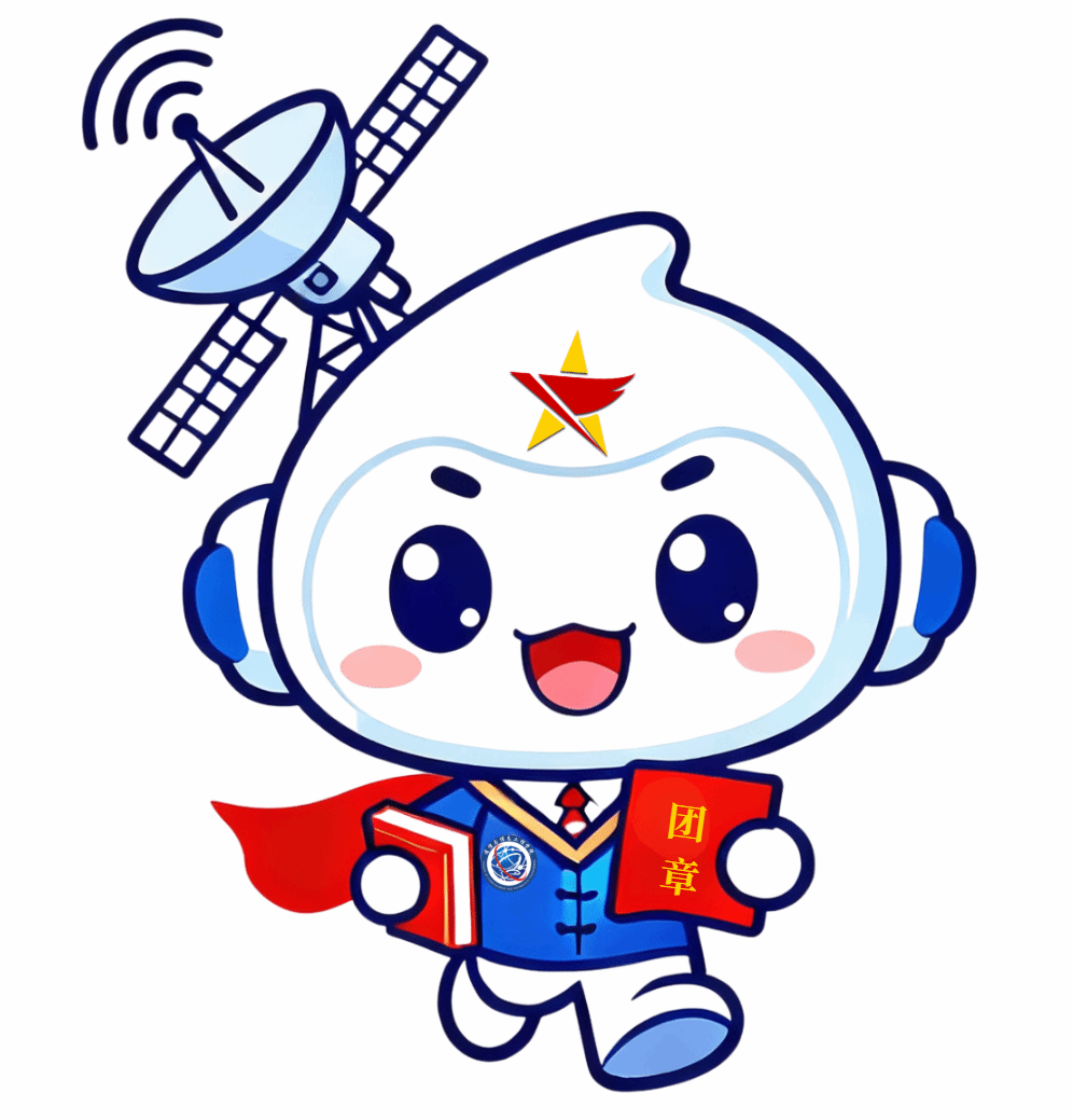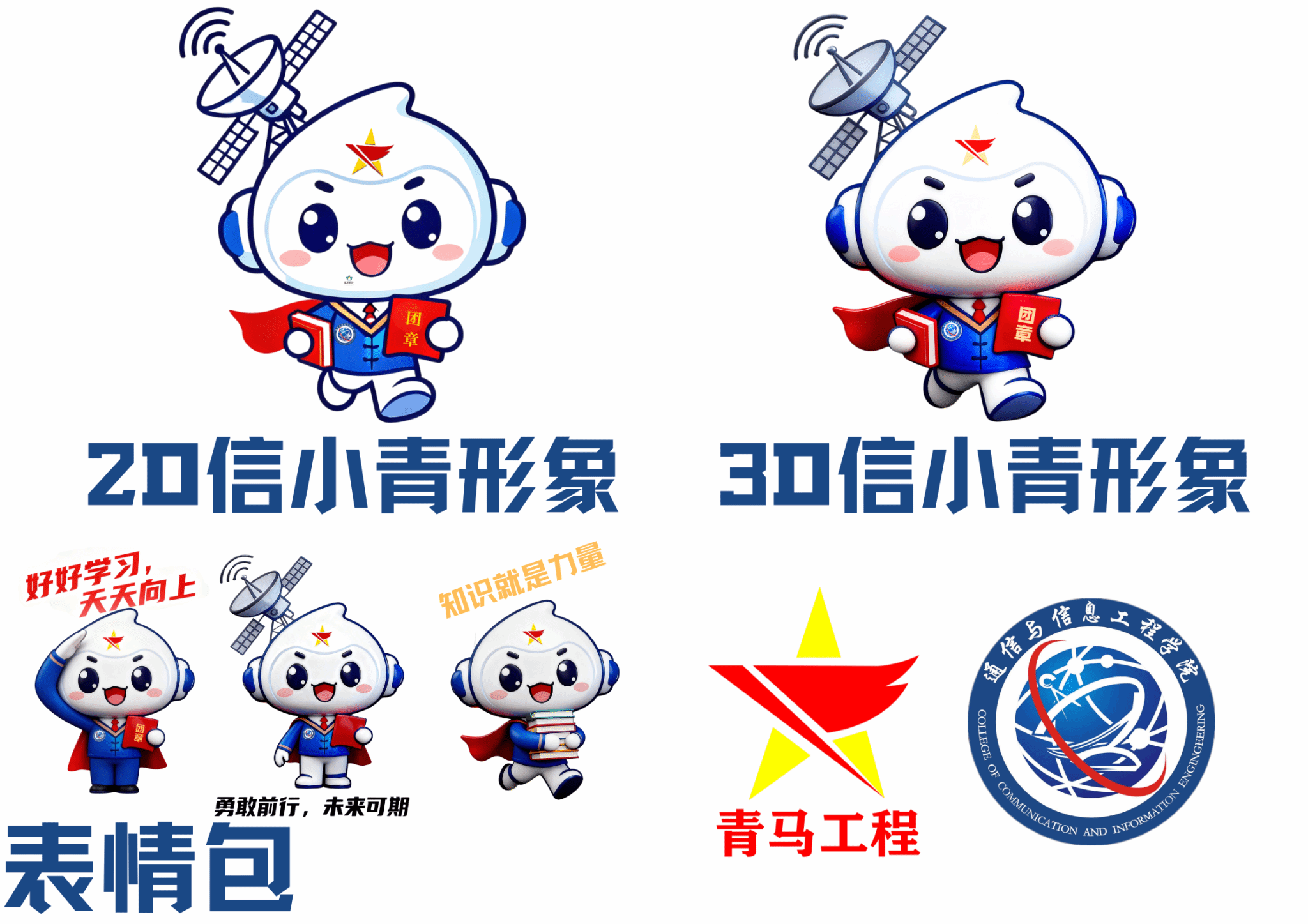 再看整体风格,“信小青”走的是“科技感”路线。一身蓝色主调,自带“理性学霸”气质,搭配代表活力与希望的白色,视觉上就很“清爽治愈”。有意思的是它的姿势——全程保持“奔跑向前”的姿态,活像赶去上青马课青马学员本人!它手里还攥着两件“硬核装备”:一只手紧握着《中国共产主义青年团章程》,是坚定理想信念的 “精神武器”,另一只手捧着书本,是钻研专业知识的 “学习 buff”,头顶顶着的卫星元素更是 “神来之笔”,直接呼应通信专业属性,寓意着青马学员将在理论与专业实践的结合中,怀揣信仰、勇毅前行。