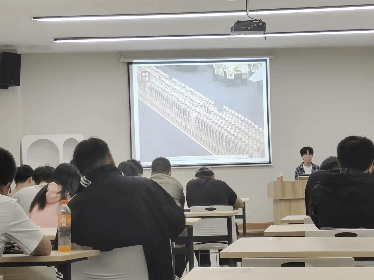 结合近期“九三阅兵”中展示的大量信息化、智能化国产装备,活动引导同学们将目光聚焦于所学的通信工程专业与国家发展的紧密联系。主持人讲解到,阅兵式上亮相的无人智能装备、网电作战新质力量,其底层支撑正是强大的通信与信息技术。这清晰地表明,现代国防安全与科技发展高度依赖于通信网络与信息技术的突破。这番讲解让同学们清晰地认识到,自己所学的专业知识是支撑国家信息化建设、维护国防安全的重要基石,从而将个人学业与科技强国战略紧密结合,树立了为国家通信事业贡献力量的远大理想。