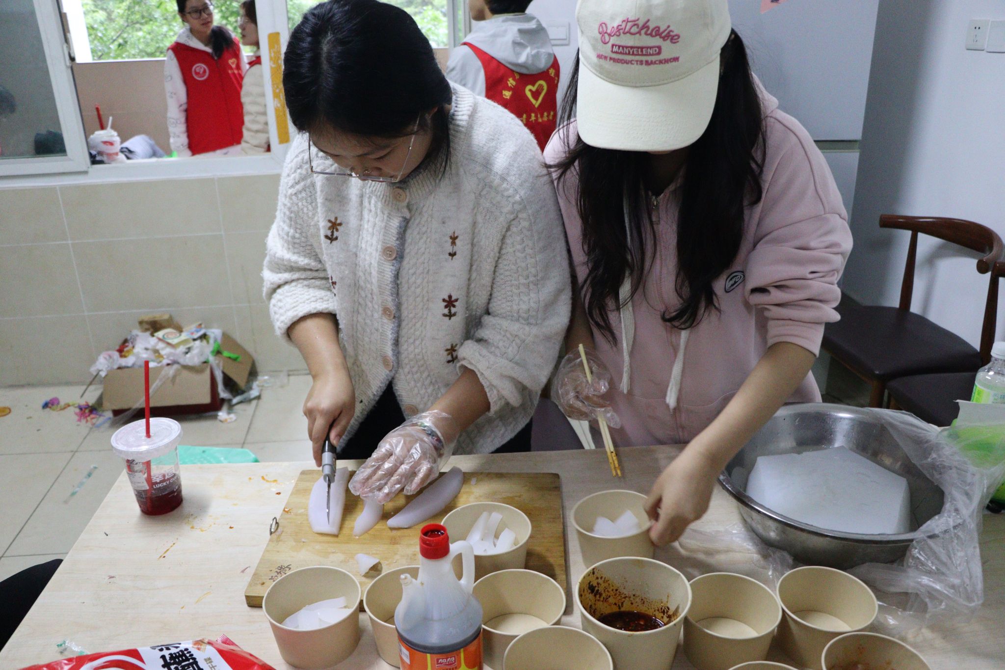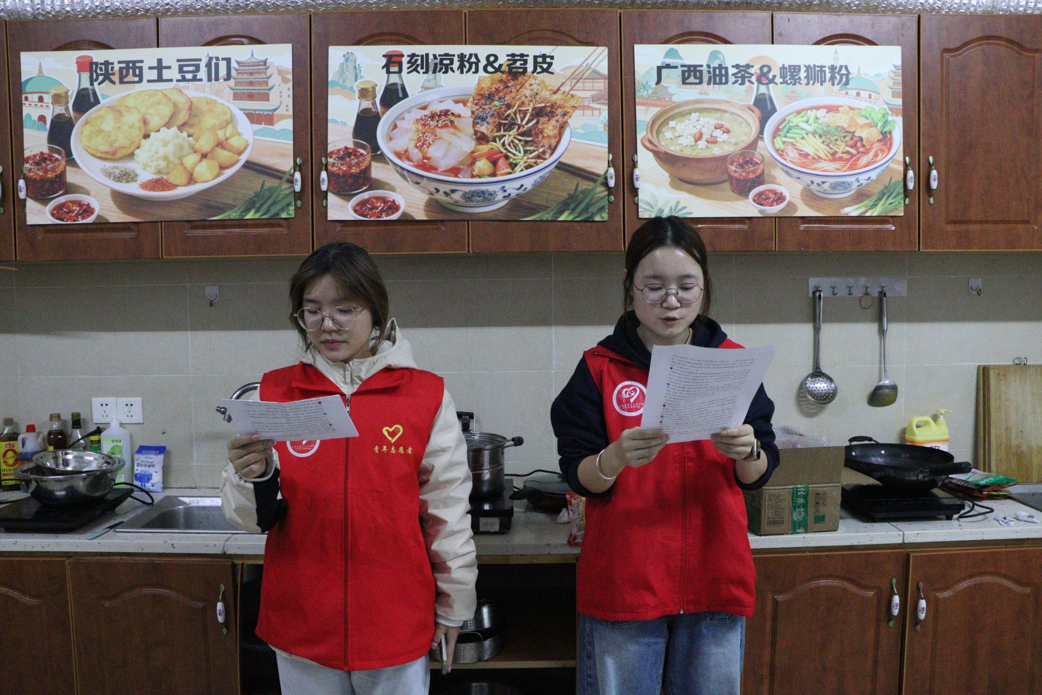 游戏结束后6名美食主理人依次亮相,带来广西油茶、甘肃兰州拉面、陕西特制土豆、大足石刻凉粉等特色美食。主理人现场邀请同学协作制作,同学们在揉面、调馅、翻炒的实操中,沉浸式感受地域饮食文化的独特魅力,不时交流各自家乡的烹饪小窍门,现场互动热烈。