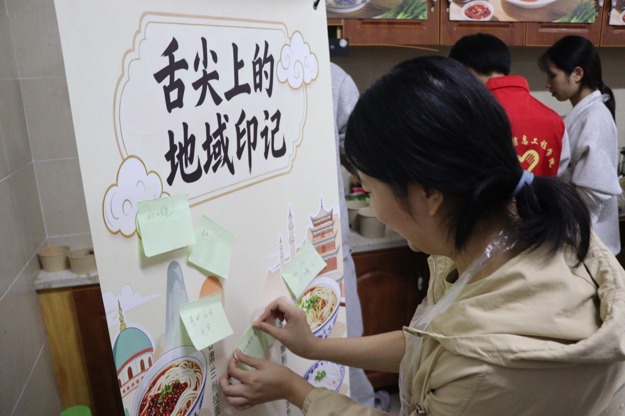 菜品完成后,大家端着餐盒自由品尝,穿梭在各个美食展示区,感受不同地域的风味碰撞。品尝结束后,同学们纷纷领取便利贴在 KT 板上写下真实感受,一张张便利贴汇成了活动的 “美食心声纪念墙”。
