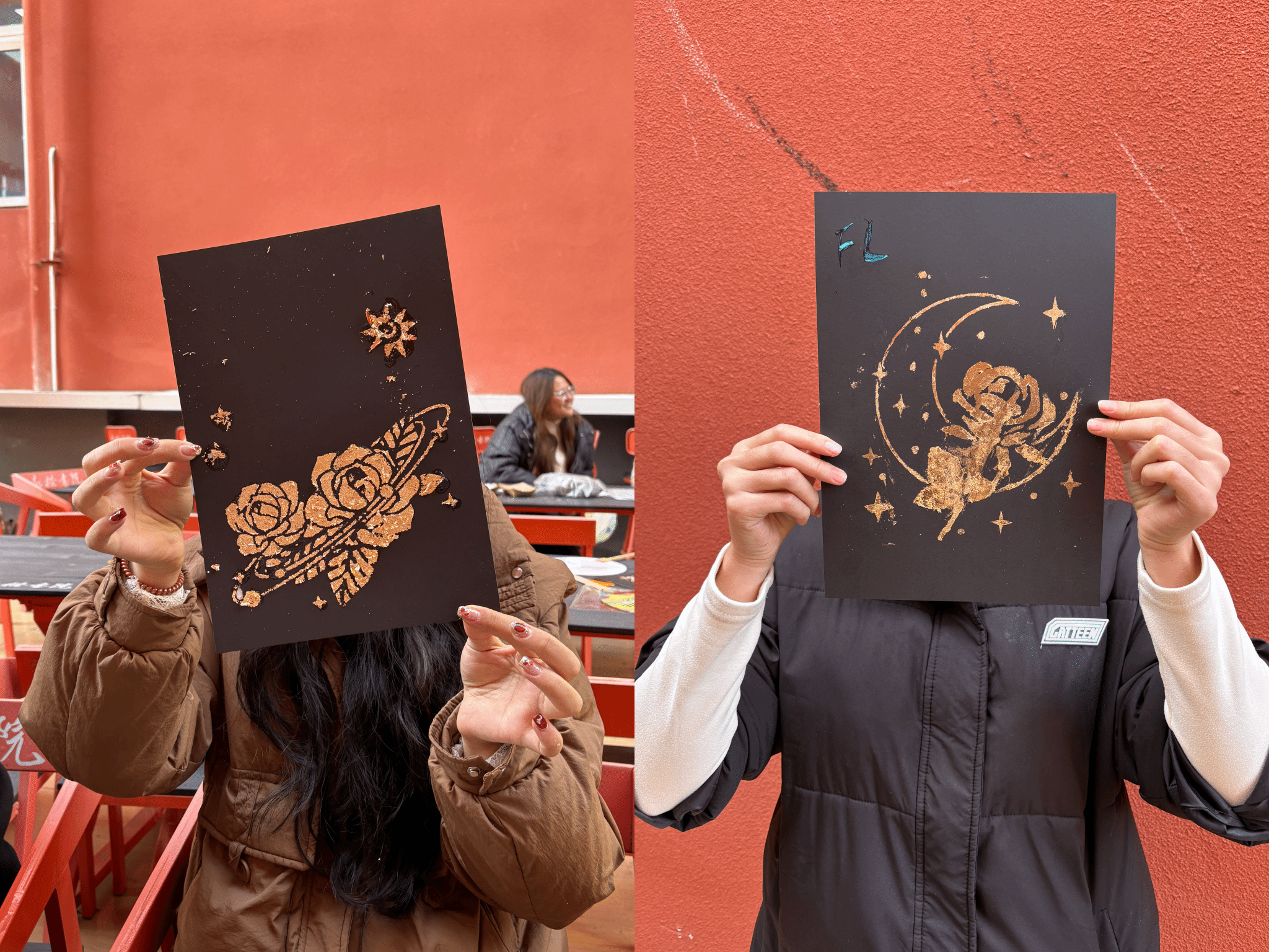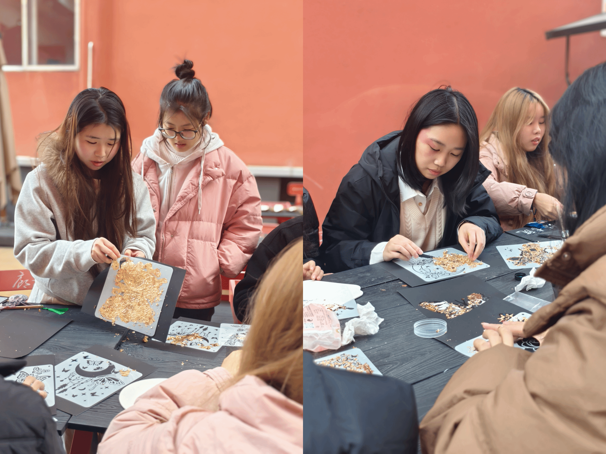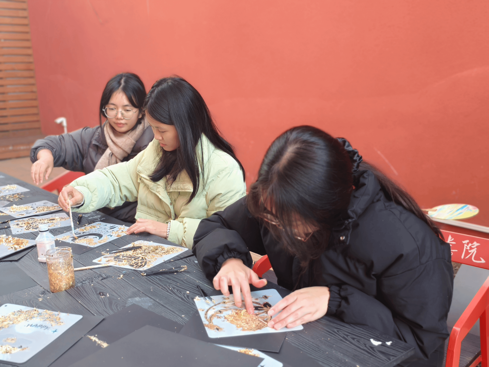 在金箔画创作中,通过将金箔贴合于图案、轻压并清理碎屑,最终使金色纹路永久呈现。同学们通过亲手实践,不仅领会到传统工艺的精妙之处,更强化了自身传承创新中华优秀传统文化的责任感。