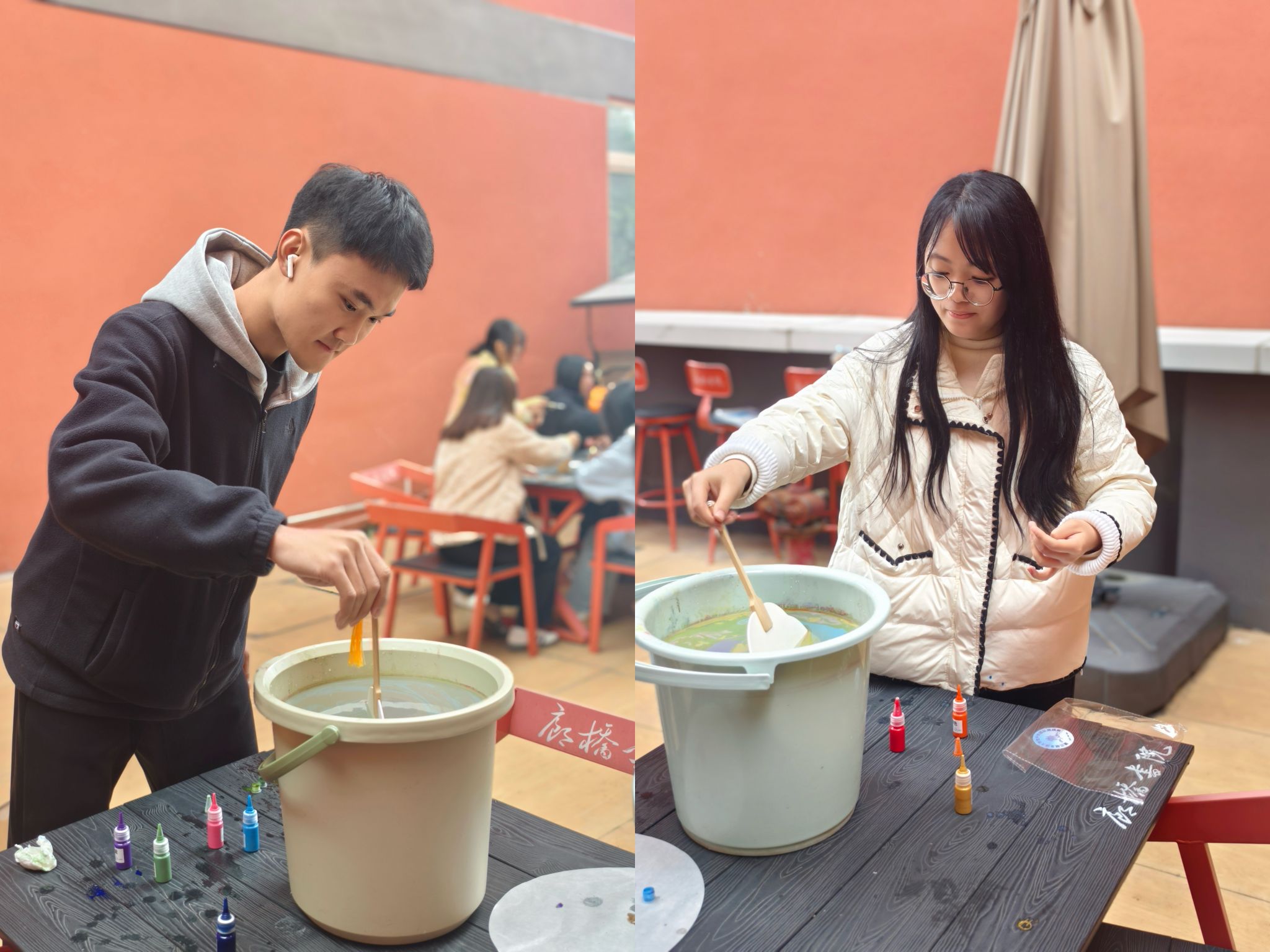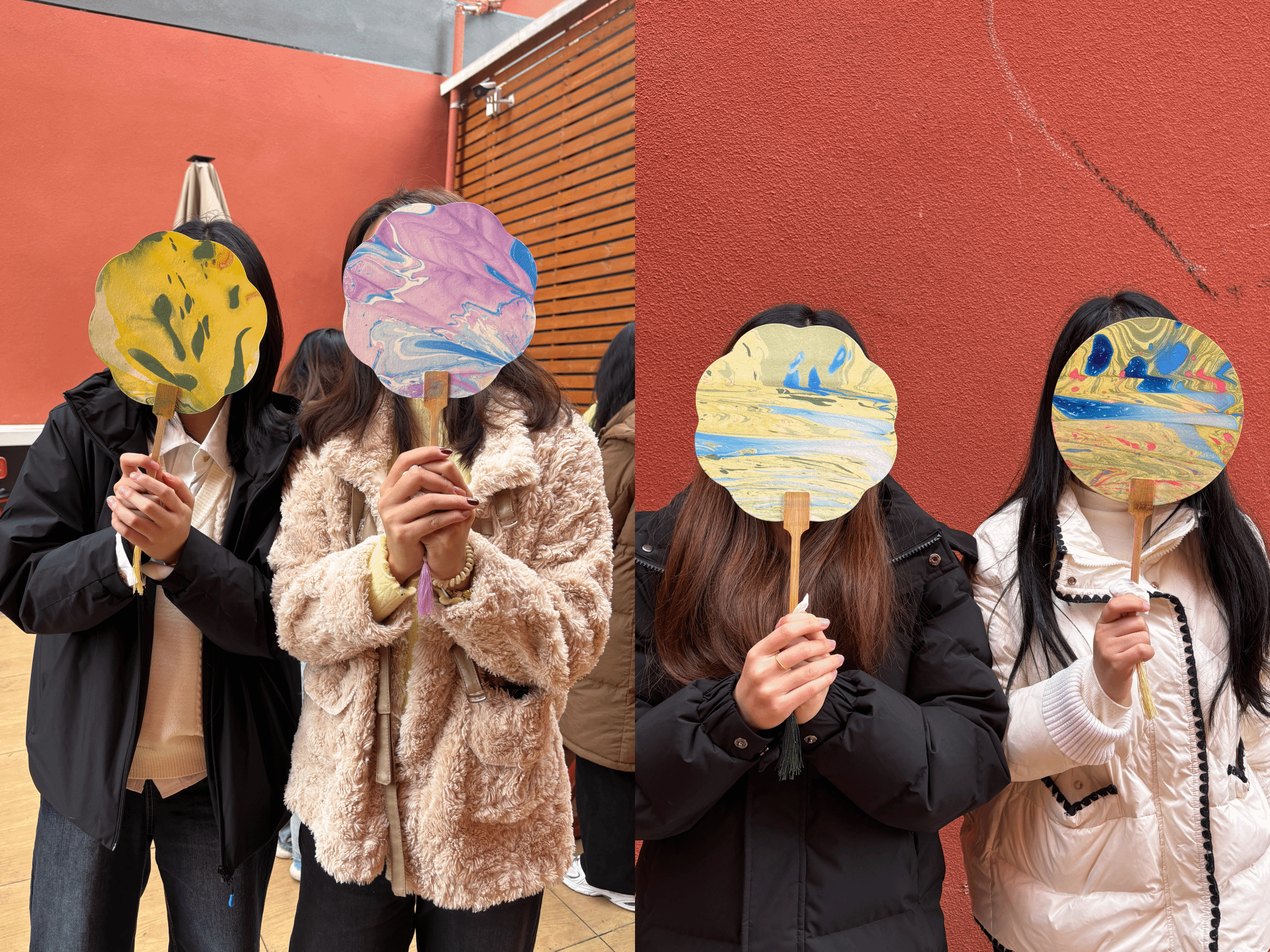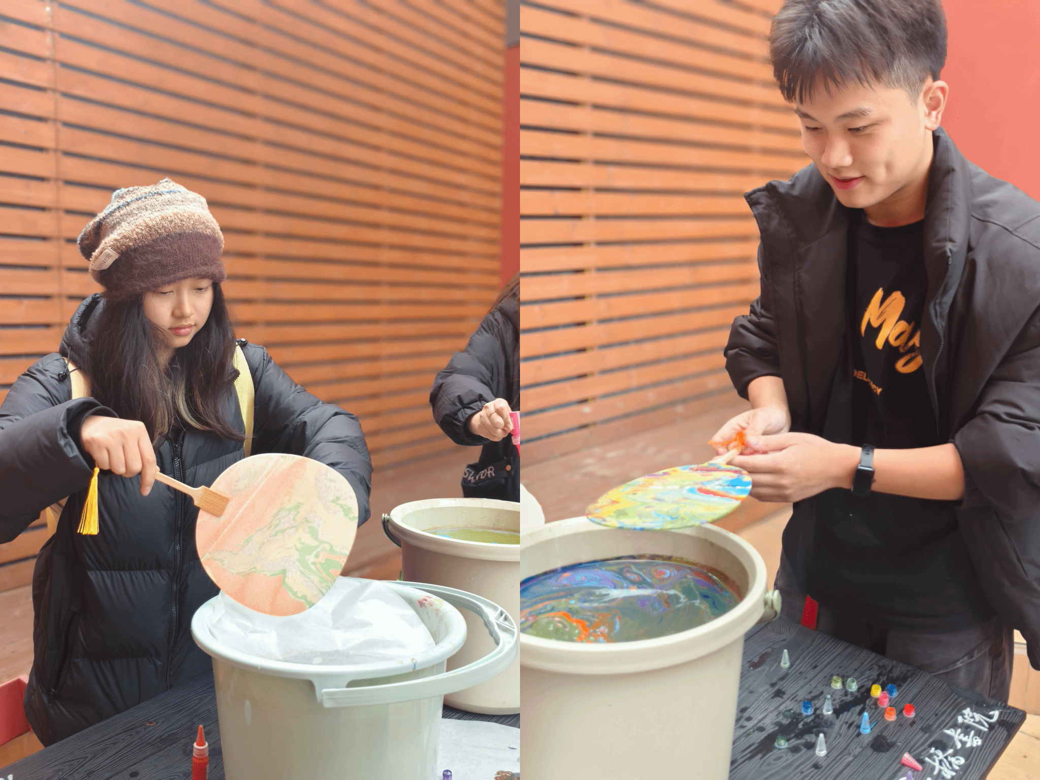 非遗漆扇制作中,水面就像一张画布。彩色大漆滴落、散开、交融,形成流动变幻的图案。当素白的扇面轻轻浸入水中再提起,水珠滑落,一幅独特的画面便印在扇面上,传统与现代在此时完美结合。对支部成员来说,亲手体验这个过程,比只看成品更能让人感受到传统工艺的魅力。通过亲手创作,同学们真正理解了传统工艺的珍贵与价值。