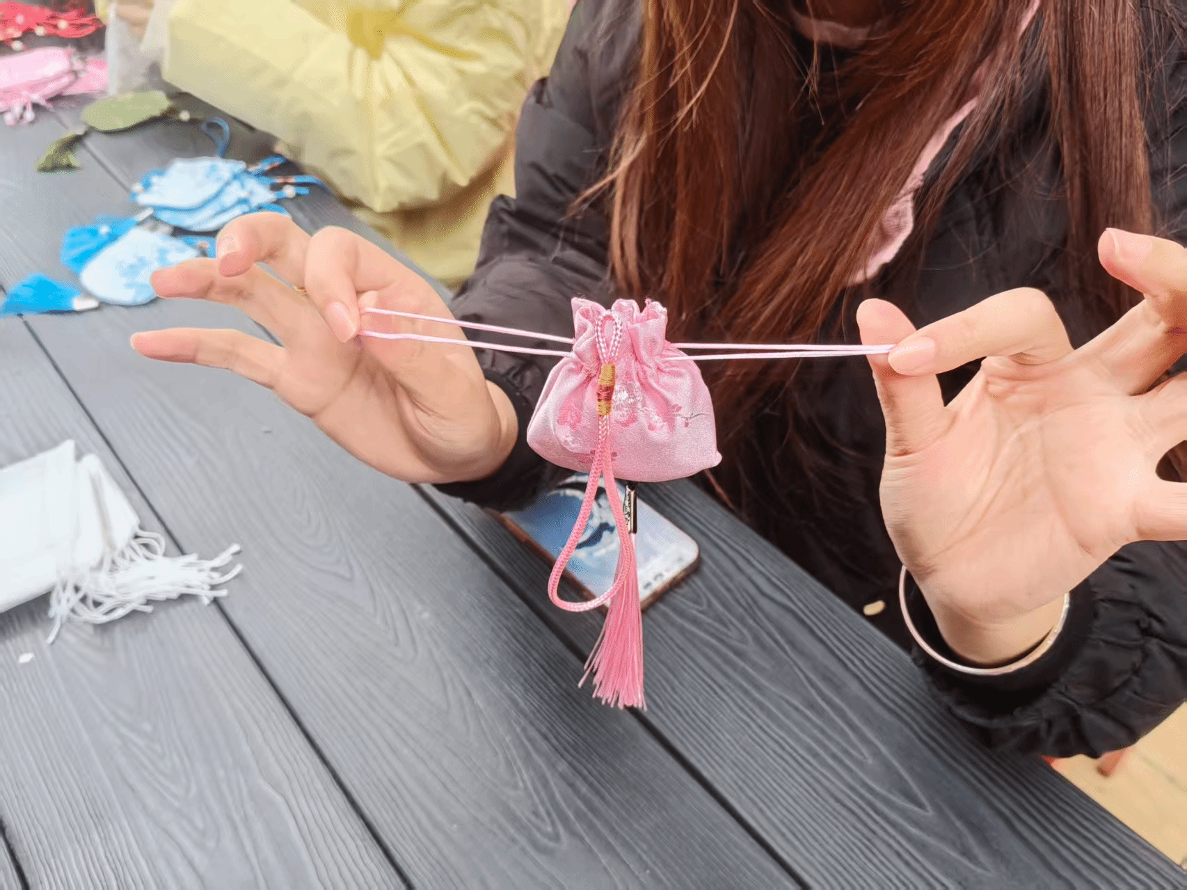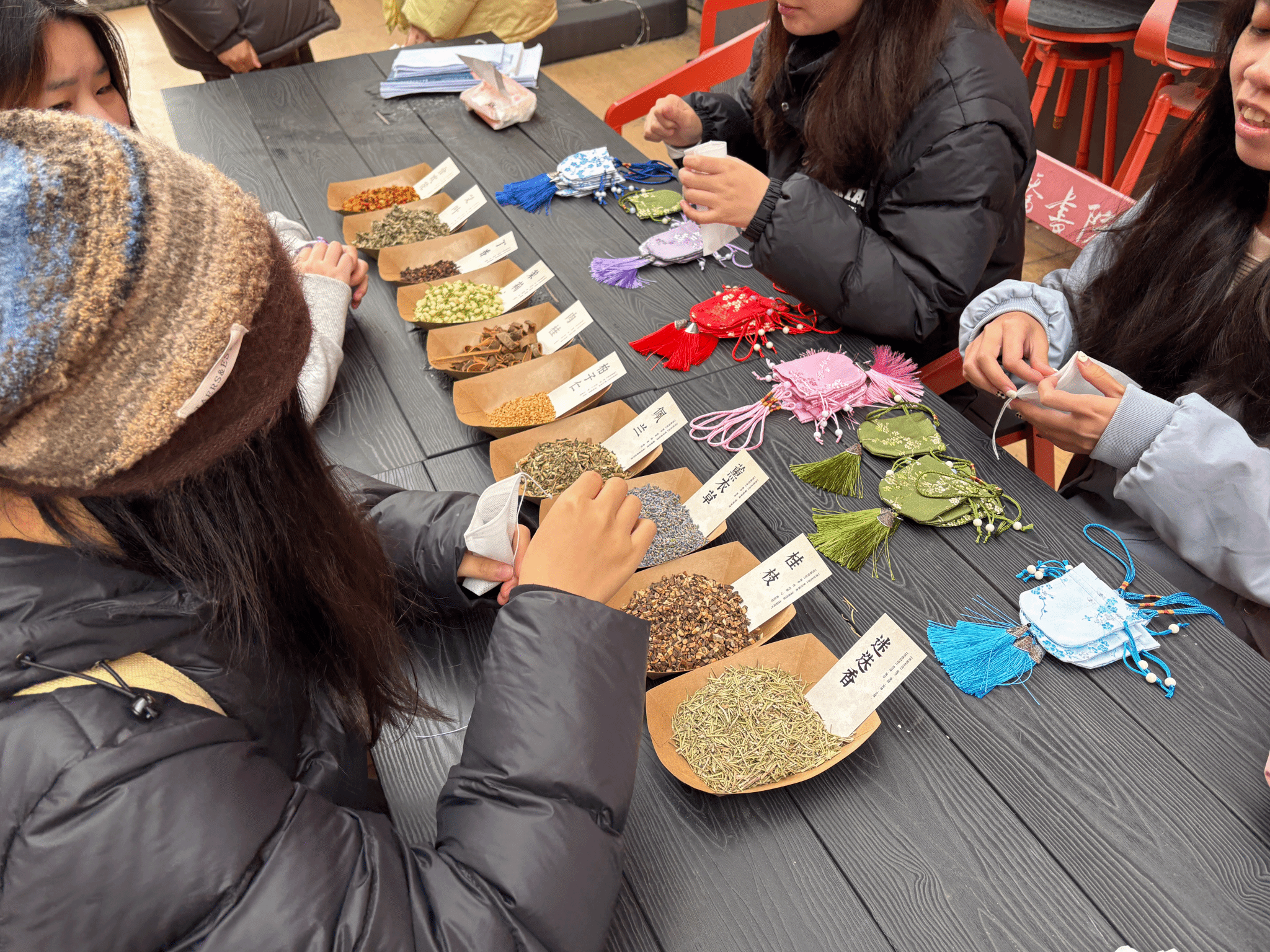在中药材香囊制作的环节中,支部成员们按照步骤,轻拾百草,将薰衣草、茉莉装入香囊,再轻轻碾压。制作完成的香囊既是实用的健康配饰,更是文化传承的载体。在这个环节中,中医药文化不再是古籍中的艰深文字,而是可感知、可创造、可分享的生活美学,真正实现了非物质文化遗产在青春手中的活化传承。