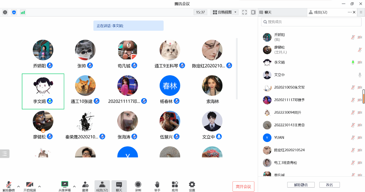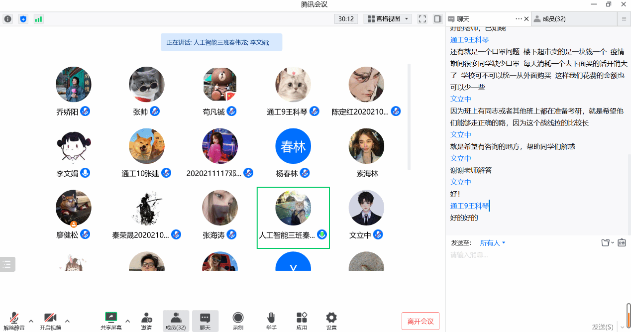 为促进我院师生之间的交流与沟通,保证教学工作的顺利开展和教学秩序的正常运行,及时发现并改进教学工作中存在的问题,2022年11月9日下午3时,通信与信息工程学院在校园疫情防控特殊时期,借助“腾讯会议”平台开展了2022-2023学年第一学期期中云端教学座谈会。参加本次会议的有通信与信息工程学院院长李文娟、唐林建,各教研室主任与辅导员老师、各年级学生代表近40人。