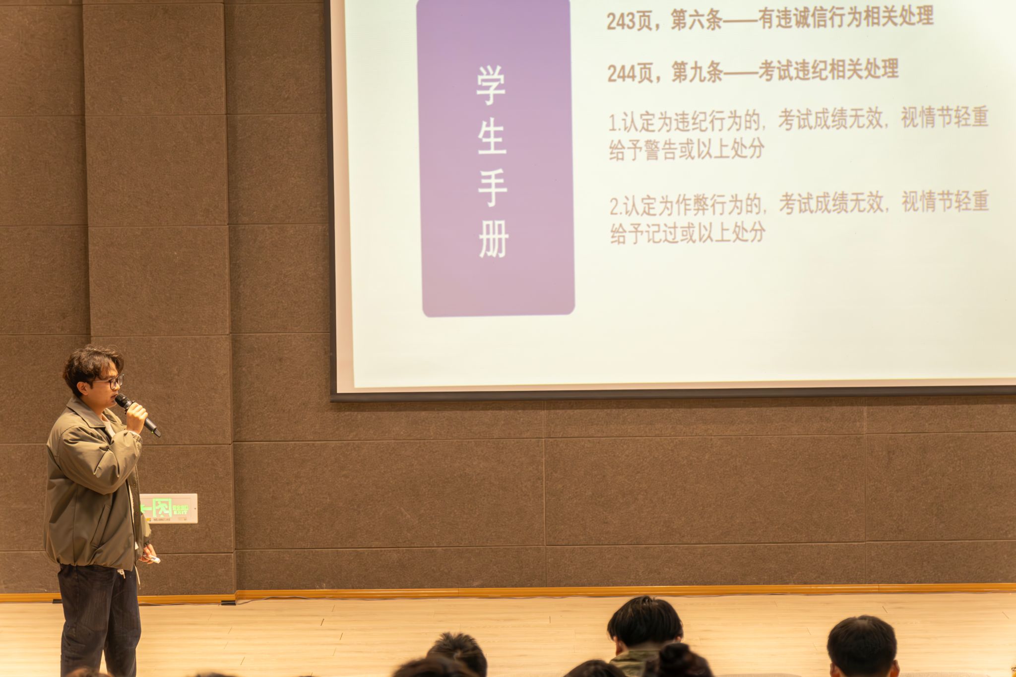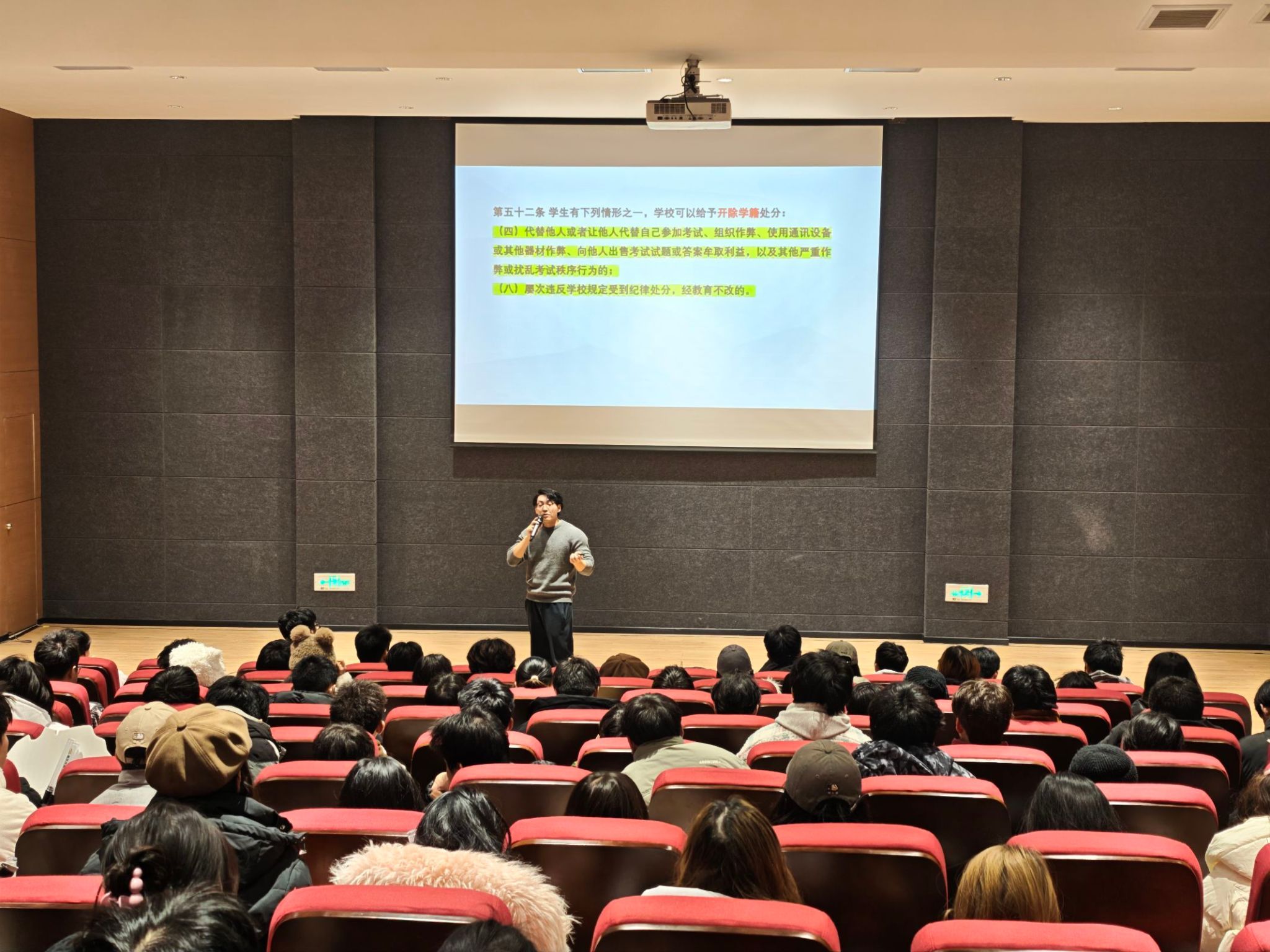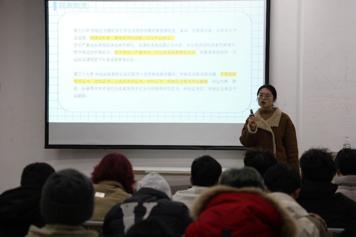 老师们围绕“紧守考风考纪,稳固学风堡垒”主题,从多方面强调了考风考纪的重要性。杨文静、贾雪梅等老师以本校考试作弊案例为突破口,深度剖析了作弊行为引发的严重后果及其不良影响,发人深省。李文静、吕海军等老师通过详细解读学校一系列考试规章制度,例如《重庆移通学院课程考核规定》以及《重庆移通学院学生纪律处分及管理规定》等文件,直观呈现了作弊行为所带来的严重后果,使得同学们对考试规则的认知更加明晰深刻,为营造优良考风学风筑牢了思想根基。杨青松、余洋等老师则采用情景剧模拟的方式,重现考试作弊被发现后的紧张氛围和处理流程,让同学们身临其境地感受作弊行为带来的巨大压力与风险,进一步强化了同学们坚守考风考纪的防线,促使诚信考试理念在学生群体中深深扎根,为打造风清气正的校园考试环境提供了有力保障。