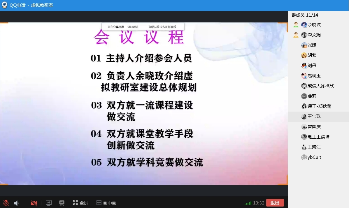 本次教研活动主要围绕一流课程建设、课堂教学手段创新、学科竞赛三个方面进行沟通交流。会议伊始,通信与信息工程学院院长李文娟教授对成都信息工程学院的大力支持及各位老师为虚拟教研室建设的辛苦付出表示感谢。同时也对教研室工作的开展提出了愿景,希望后期两校共同搭建协同创新的交流平台,共建课程、共享课程资源,以在线课程为载体,创新实践为基础,通过跨区域协作整合校内外资源、创新研究方式、利用互联网+智慧教育的先进手段,探索教学改革新思路、新方法。希望通过虚拟教研室的建设,两校能够共同打造出一支高水平的教学团队,培育优质教学研究与实践成果。