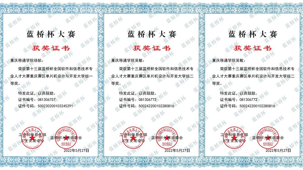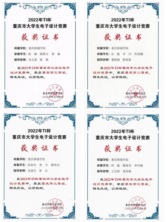 科创工作室的学生在教师团队的陪伴下,勤奋练习、不断成长、突破自己。陆续在2022-2023学年第一学期参加了2022年全国电子设计大赛、第十三届蓝桥杯全国软件和信息技术专业人才大赛、第六届“物联天下,智能有方”电子设计大赛、第五届“行者杯”电能小车制作大赛等赛事活动,共斩获荣誉15项,其中省级荣誉7项,省级一等奖1项、二等奖3项。