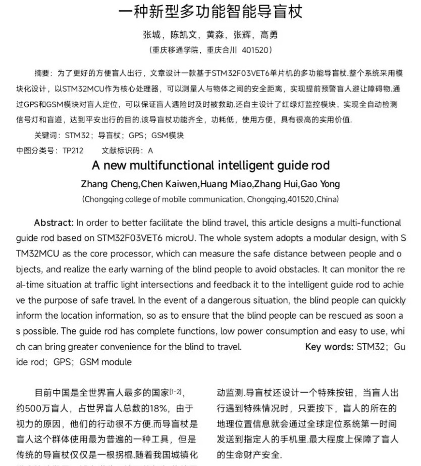 科创工作室成员从理论出发,不断地研发、实践,再将成果形成经验进行理论输出。通过每一次的学科竞赛和研发实践,基于理论与实践相结合的总结经验,他们联合撰写并发表了《基于stm32的一种新型多功能智能导盲杖的设计》期刊论文,文章讲述了以STM32MCU作为核心处理器,可以测量人与物体之间的安全距离,实现提前预警盲人避让障碍物的导盲杖设计原理。同时,通过GPS和GSM模块对盲人定位,可以保证盲人遇险时及时被救助。并自主设计了红绿灯监控模块,实现全自动检测信号灯和盲道,帮助盲人达到平安出行的目的。他们一边钻研专业,一边运用于创新实践,以独特视角诠释青年学子的大爱与责任。